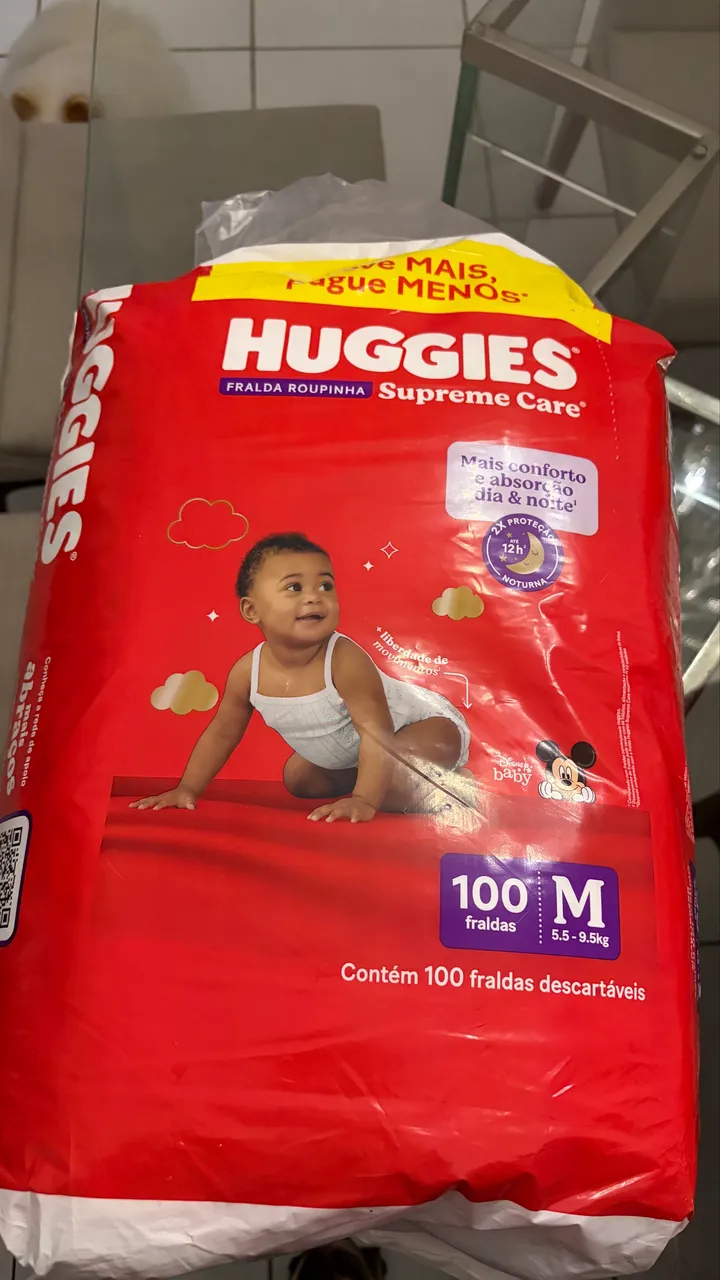 Fraldas Huggies Supreme Care, oferecendo conforto e absorção para o seu bebê. Com proteção noturna de até 12 horas, garantindo noites tranquilas e dias mais alegres. Contém 100 fraldas descartáveis, tamanho M (5.5-9.5kg).