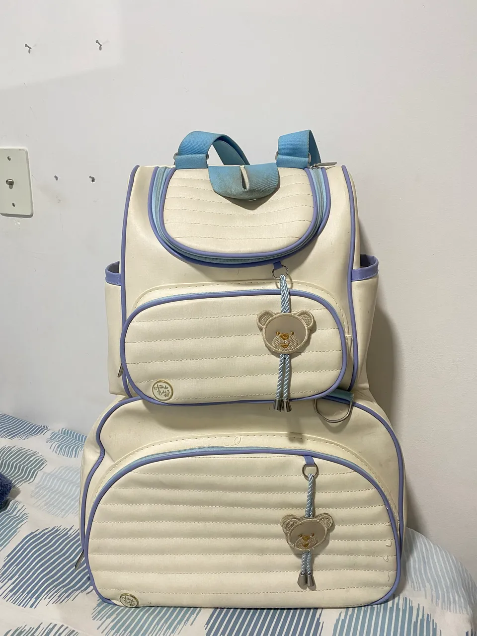 Lindo kit de bolsa infantil, perfeito para levar tudo o que seu bebê precisa com muito estilo e praticidade. Design charmoso e cores delicadas.