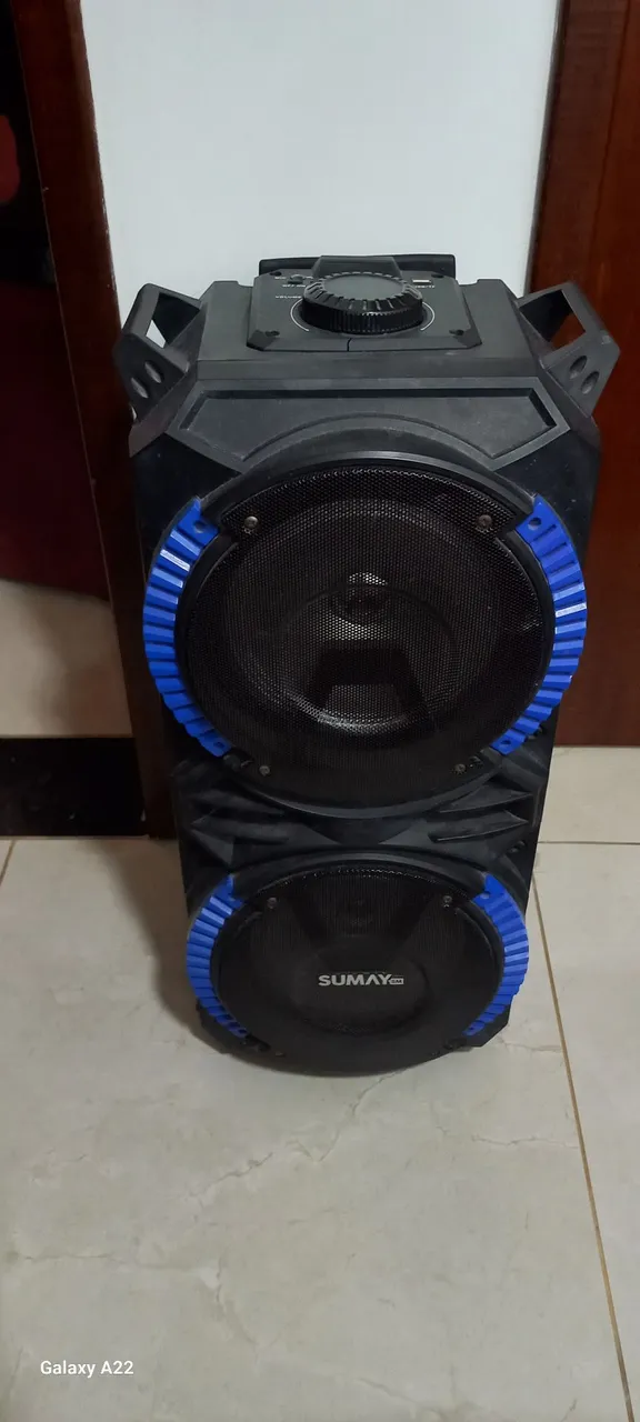 Caixa de som amplificada Sumay blutooth portátil, acompanha carregador e controle. Ela está com defeito liga porém não aumenta o volume.