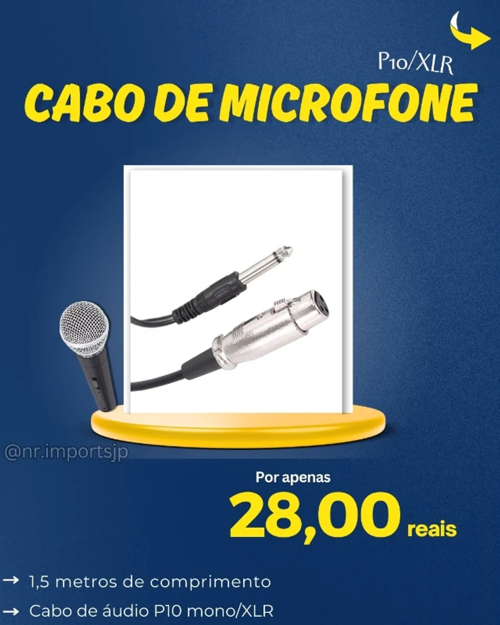 Cabo de áudio P10 mono/XLR para microfone, ideal para conectar seu microfone a um computador, mixer ou outro dispositivo de áudio. Comprimento de 1,5 metros, proporcionando flexibilidade e alcance.