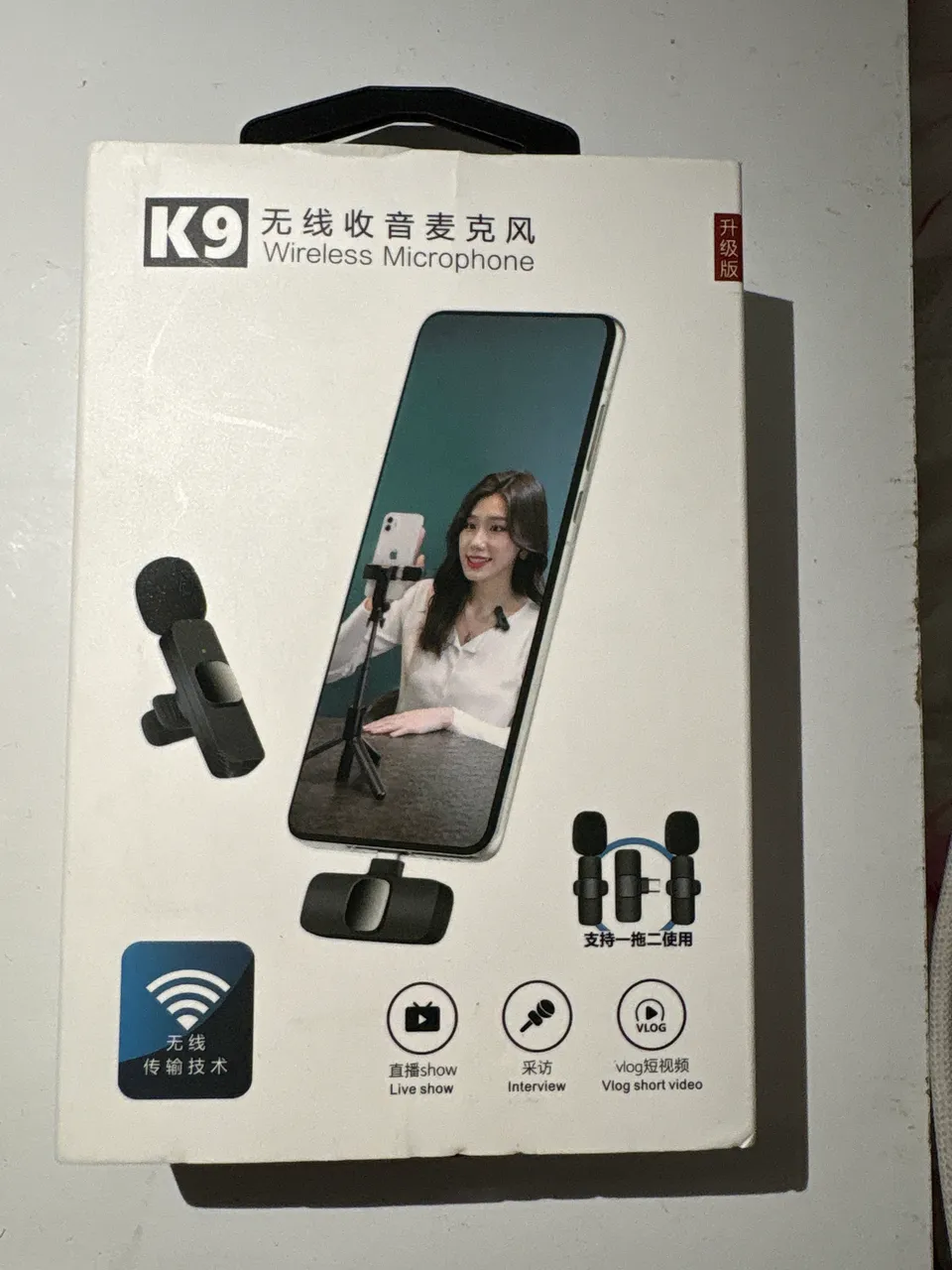 Microfone sem fio K9, ideal para transmissões ao vivo, entrevistas e criação de vídeos para seu vlog. Conectividade otimizada para celular. Leve sua produção de conteúdo para o próximo nível!