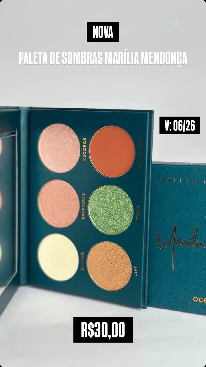 Paleta de Sombras Marília Mendonça Oceane, inspirada na rainha da sofrência! Com tons vibrantes e de alta pigmentação! Data próxima da validade