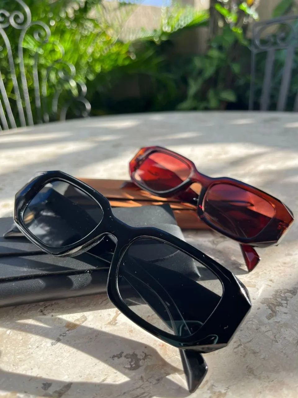 Óculos de sol com design estiloso e lentes de alta qualidade para um visual impecável. Disponível no preto e marrom. Acompanha capinha e lenço.