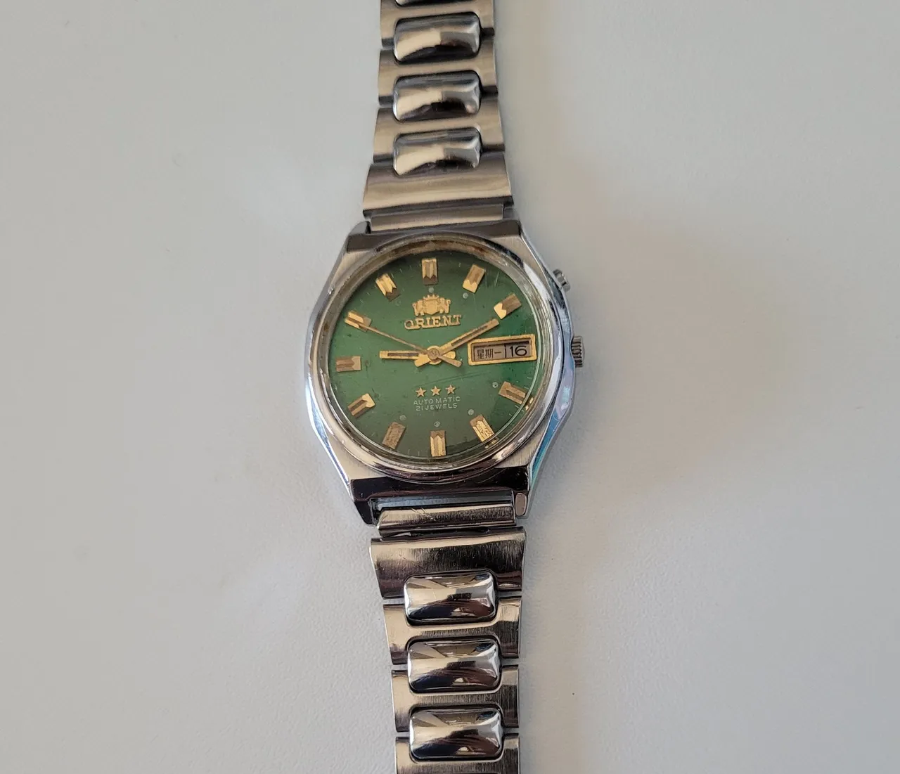 Relógio Automático Orient 3 estrelas; Calibre 46941; Pulseira com fecho assinado; Calendário em Inglês e Chinês; Funcionando tudo, trabalhando certinho, mas não foi revisado para a venda. Calendário virando perfeitamente, inclusive na coroa e no botão de mudança do dia da semana. Para pesquisa: vintage Mido cyma cymaflex eska enicar militar field seiko calibre swatch rolex bulova tissot relogio orient white star whitestar casio gshock fossil camy cauny classic omega olvino suíço poljot vostok technos tecnos seculus empório armani guess vintage antigo coleção colecionador eterna eternamatic suiço suico swiss antigo certina ricoh Pelé Pele sportsmatic minerva vintage citizen movado sicura tressa vulcain classic studio gruen edox universal roskopf junghans mondaine rado soviet cosmos kontiki miyota nivada relogio relógio doxa lanco mondaine matic lavina Automático automatic quartz bateria pilha automatico conservado