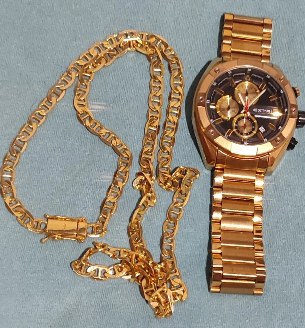 Conjunto elegante para você que busca sofisticação. Relógio dourado com design moderno e corrente que complementa seu visual com requinte e estilo.