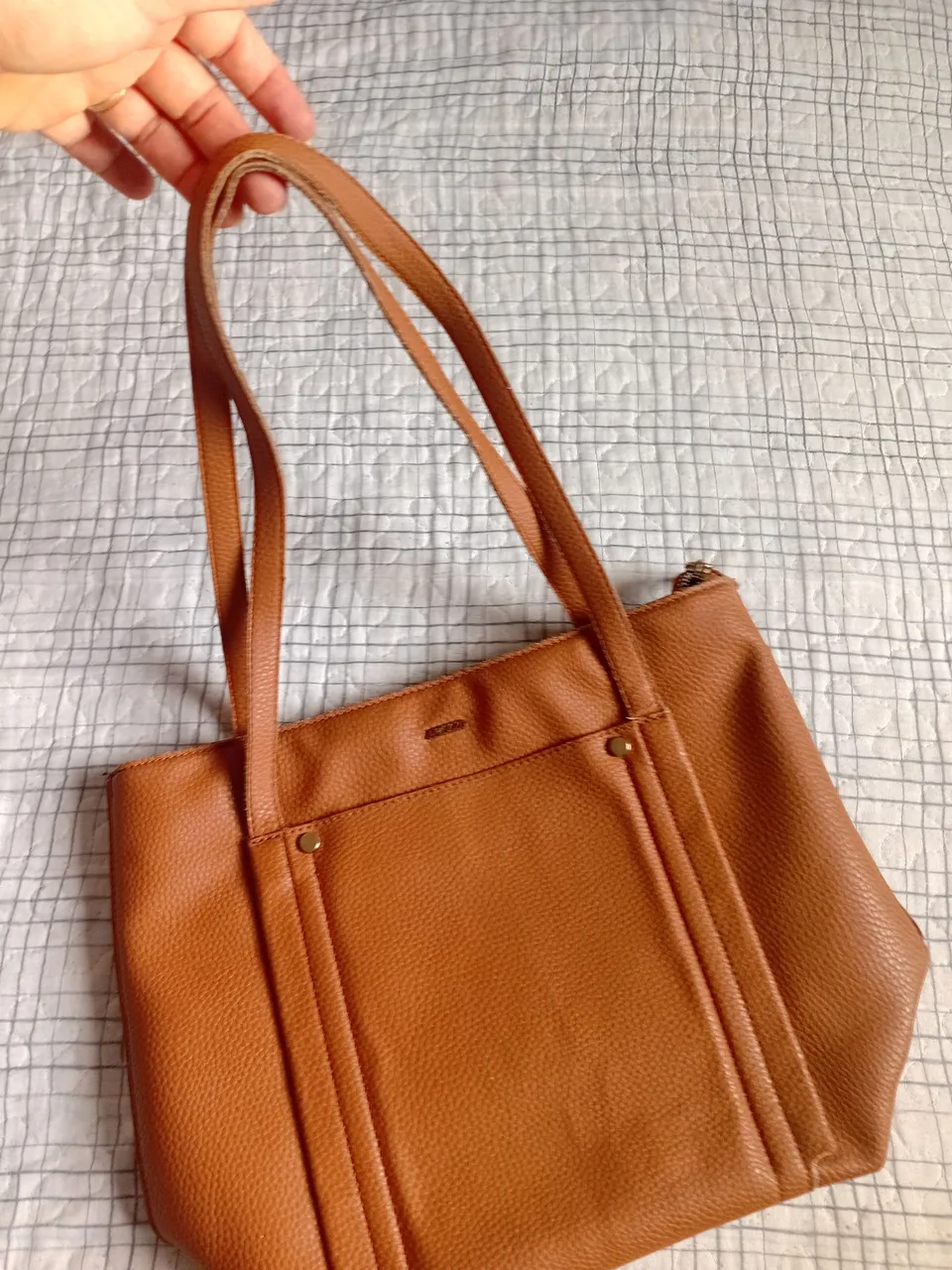 Descrição: Bolsa Shopping marrom. Possui duas alças de ombro, fecho superior em zíper. Possui bolso grande e logo da Arezo na parte da frente.