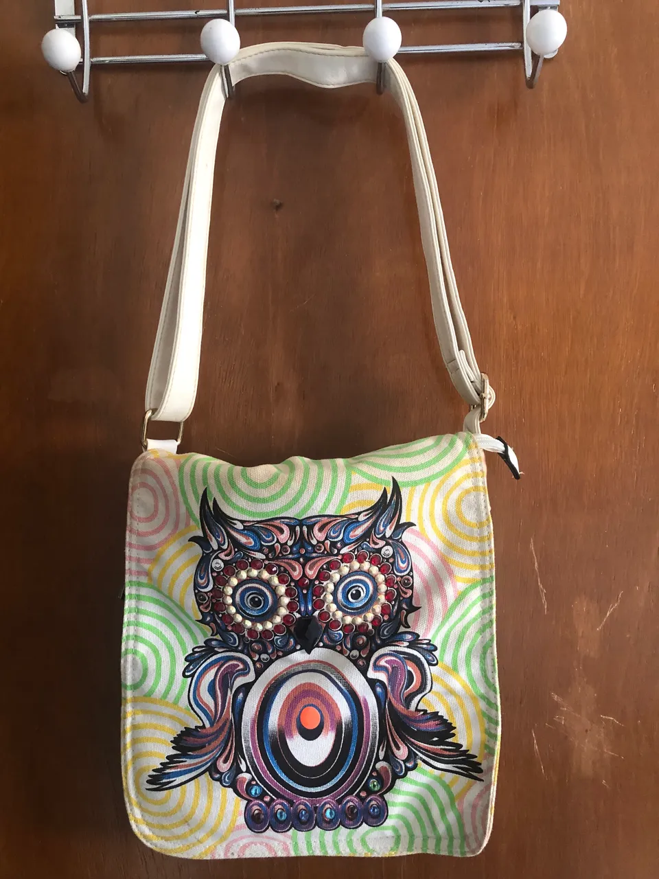 Bolsa de tecido, com estampa frontal de coruja, com diferentes cores e pedras. Tem uma alça regulável branca, 3 bolsos externos e um bolso interno. Em bom estado, pouco usado, única avaria é o puxador do zíper faltando no compartimento principal.