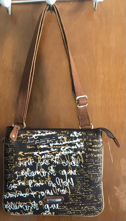 Bolsa da Carpisa, pequena, cor marrom com estampa escrita em bege e branco. Tem 3 compartimentos principais e 3 compartimentos internos. Dimensões: 21cm de altura, 23cm de comprimento e 15cm de largura (quando aberto no máximo). Pouco usada, em boa condições, só apresenta alguns sinais de desgaste na alça e nas bordas por conta do courino que revestia e esfarelou ao longo dos anos.