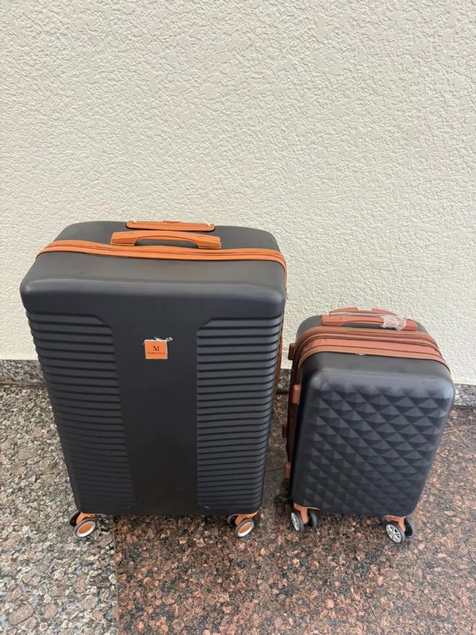 Conjunto de malas de viagem pretas com detalhes em marrom, ideais para suas aventuras. Design moderno e resistente para transportar seus pertences com segurança e estilo.