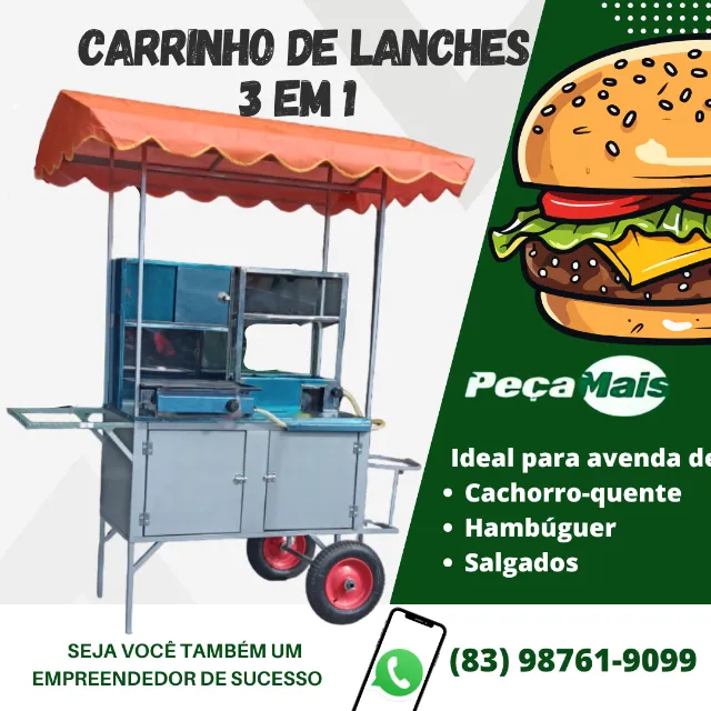 Tenha seu próprio negócio com este carrinho de lanches 3 em 1! Ideal para vender cachorro-quente, hambúrguer e salgados. Comece a empreender agora!