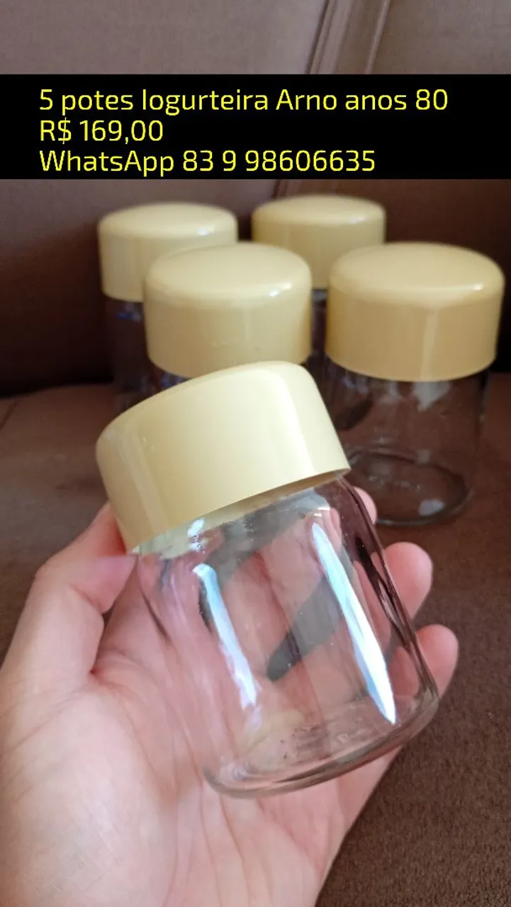 Conjunto com 5 potes de iogurteira Arno dos anos 80. Peças originais e em ótimo estado, ideais para colecionadores ou para uso na cozinha. Adicione um toque vintage à sua casa!
