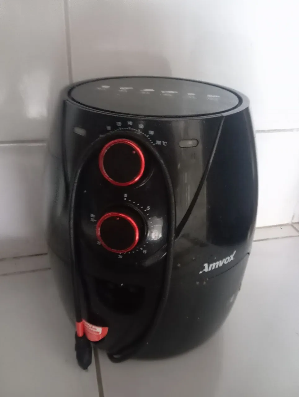 Air fryer funcionando normal, só está sem o puxador e meio suja dentro, já vai com a proteção de silicone.