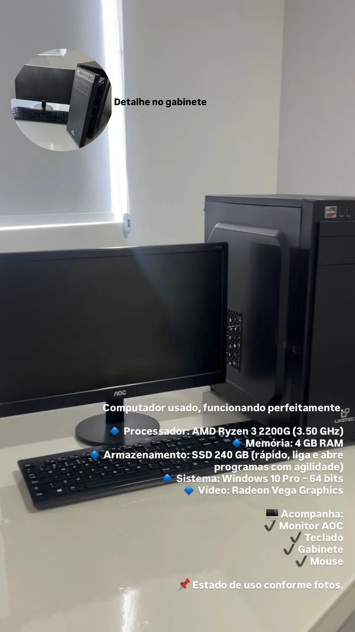 Computador completo com processador AMD Ryzen 3 2200G, 4GB de RAM e SSD de 240GB. Ideal para tarefas diárias e com bom desempenho.