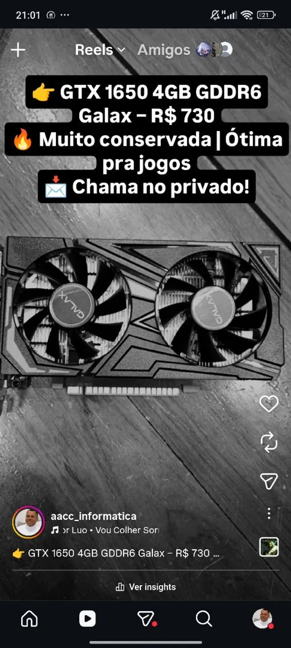 ? GTX 1650 4GB GDDR6 Galax - R$ 730 ? Muito conservada | Ótima pra jogos ? Chama no privado!