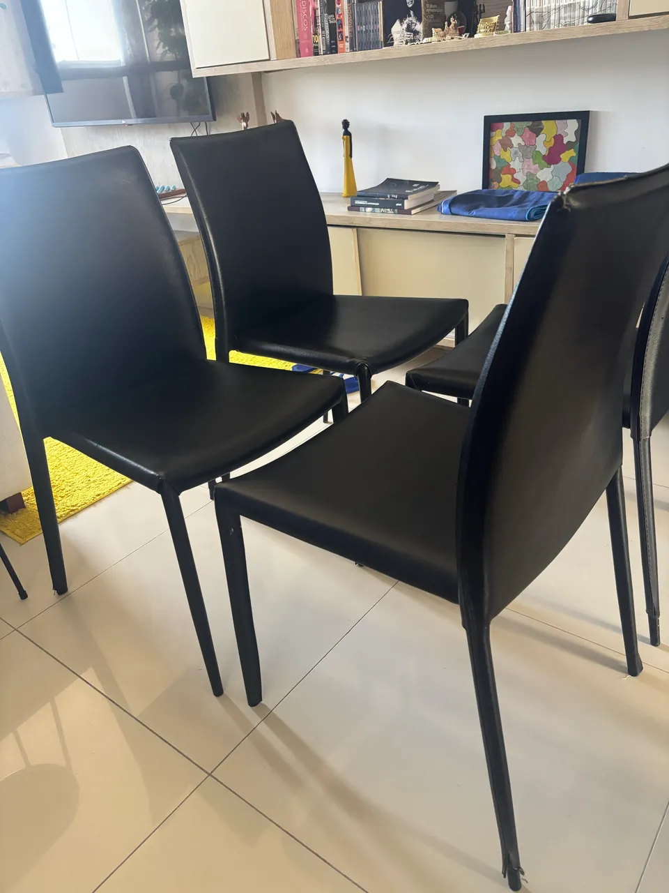 Conjunto com 4 cadeiras pretas, em courino, design moderno para sua sala de jantar ou escritório. Compradas na Tokstok.