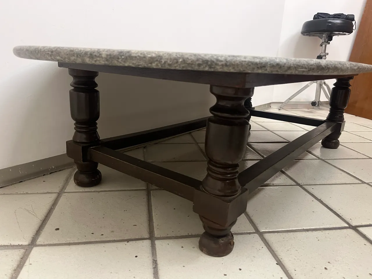Linda mesa de centro vintage com tampo de granito, perfeita para dar um toque de requinte e sofisticação à sua sala. Apenas um dos pés está com defeito, que pode ser restaurado, retirada no Aeroclube Wspp: