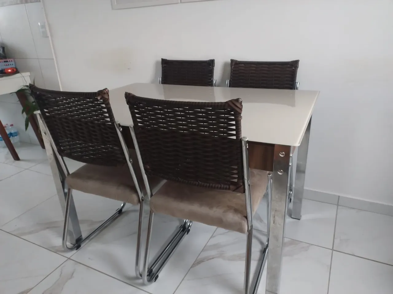Mesa de jantar medindo 1,20 por 1,80. Estofados das cadeiras novos. Motivo da venda, ficou grande no meu apartamento. Não aceito trocas. Somente venda. Para buscar.