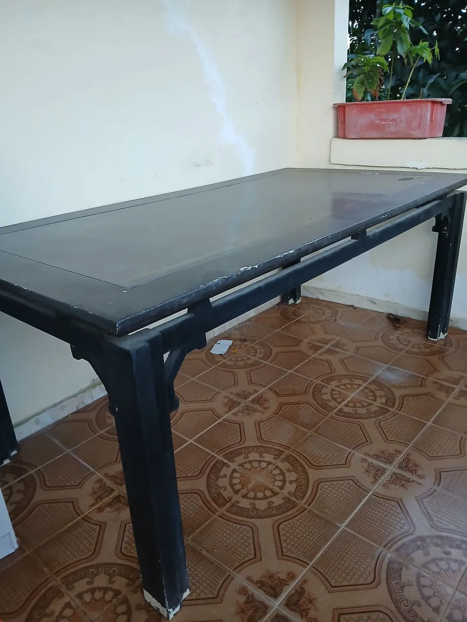 Linda mesa de madeira com tampo de vidro temperado intacto, perfeita para sua sala de jantar, usar em decoraç ão de festas, banquetes em área externa, etc. Ela pega até 8 cadeiras. É madeira pura. Não pega cupim.