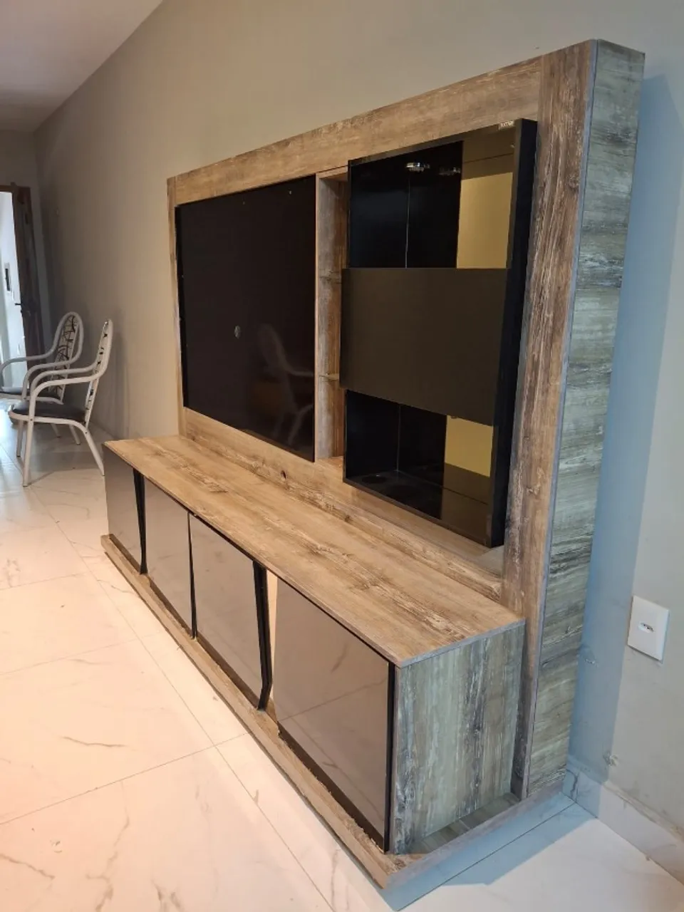 Transforme sua sala com esta estante elegante e funcional! Amplo espaço para TV e objetos decorativos, com divisórias e espelho no detalhe. Perfeita para organizar e embelezar seu ambiente. MEDIDAS: 2,30x1,72x0,55.