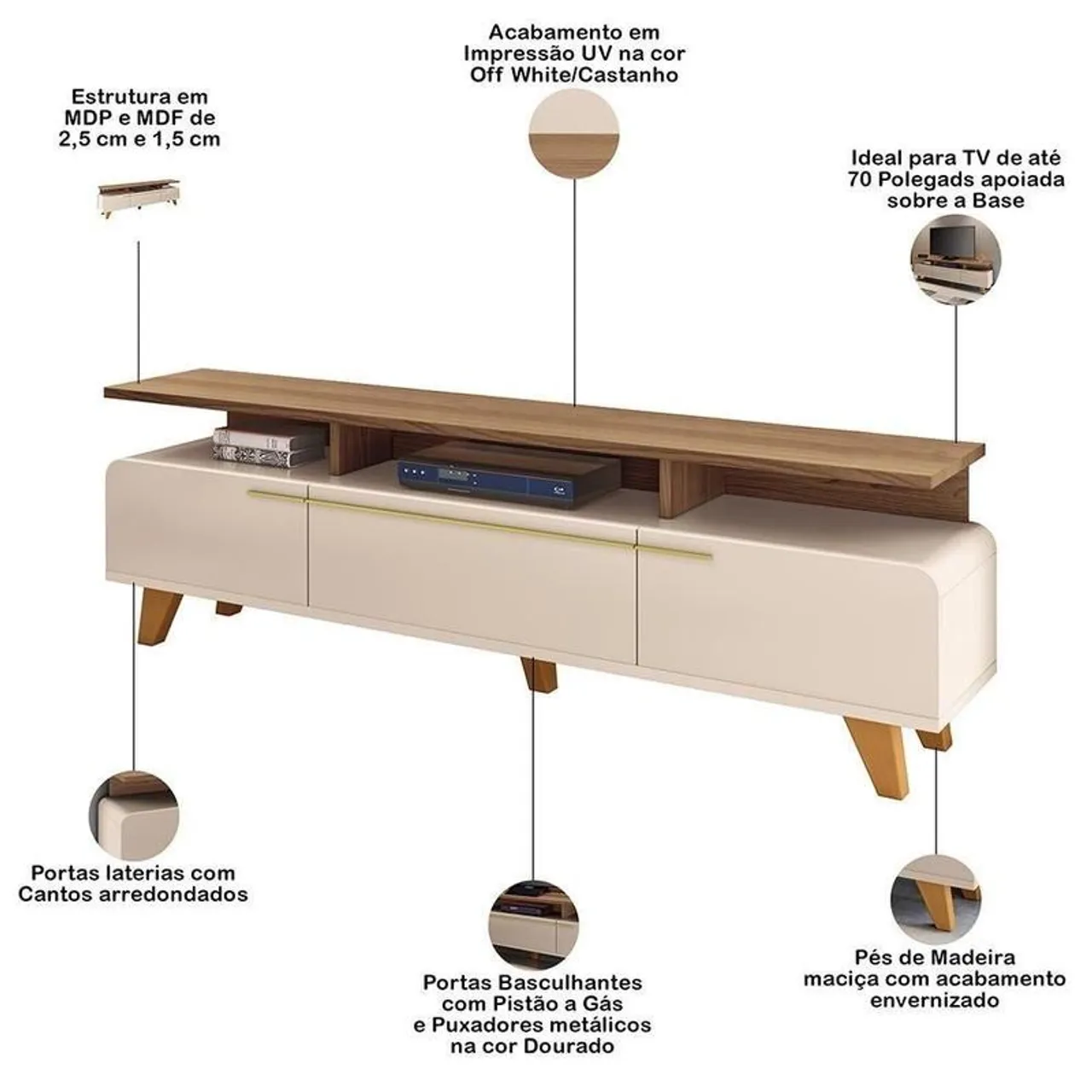 Vendo o rack em excelente estado de conservação, semi novo com apenas 8 meses de uso, para sua sala de estar! Com design moderno e funcional em Off White e detalhes em Castanho, este móvel é ideal para TVs de até 70 polegadas. Possui portas basculantes com pistão a gás e puxadores dourados, além de pés de madeira maciça.