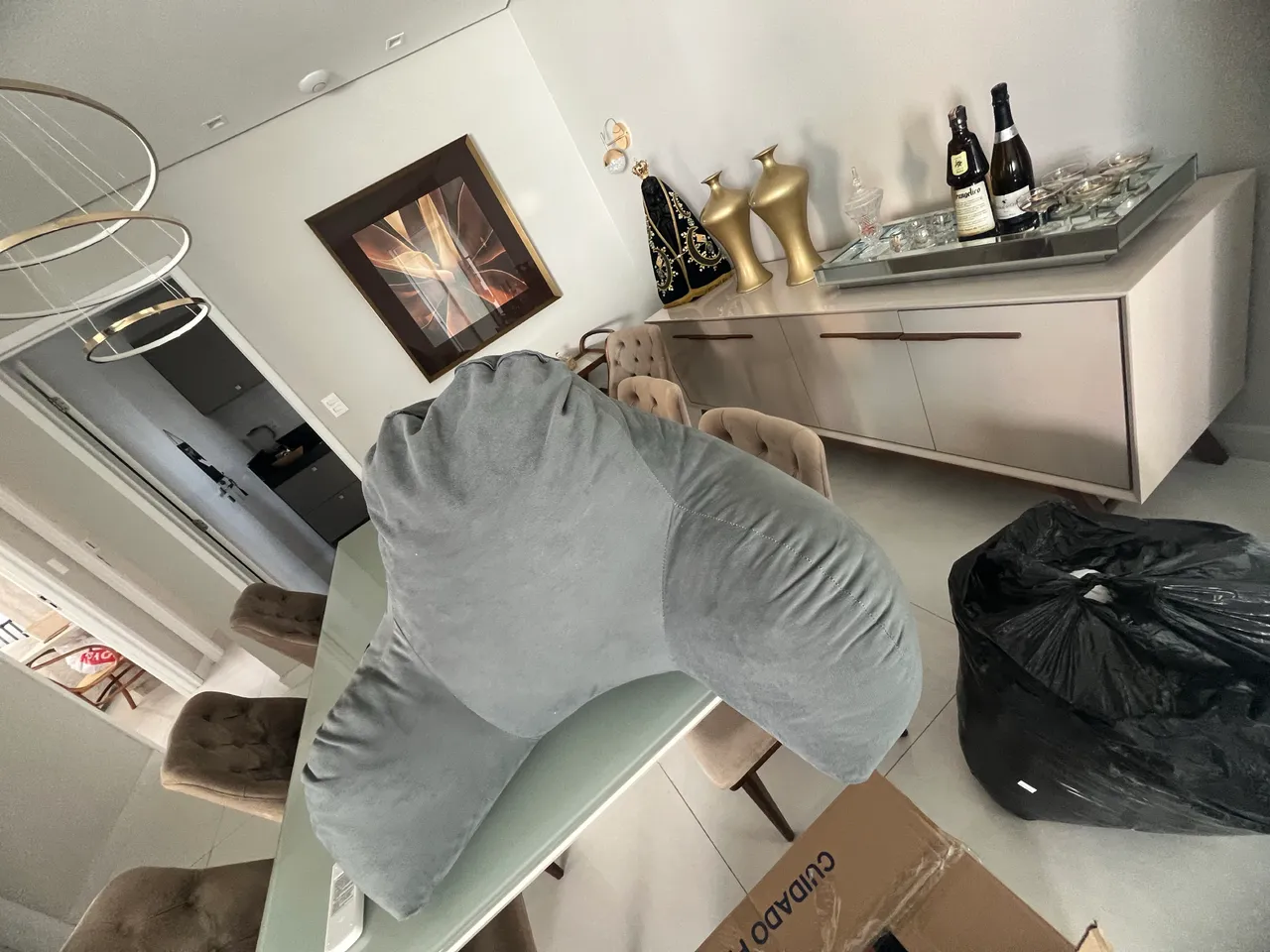 Esse formato ?abraça? o corpo, ajudando a manter postura e conforto. Pela cor e tecido, parece aquelas de veludo/microfibra, bem macias.