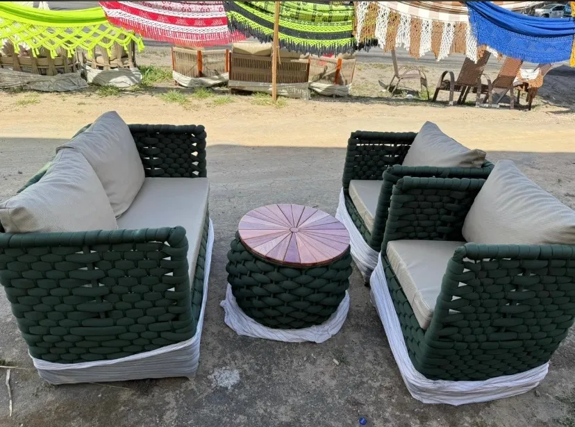 Desfrute do conforto e elegância com este conjunto em corda náutica. Perfeito para relaxar em ambientes externos, este conjunto adiciona um toque de sofisticação ao seu espaço.