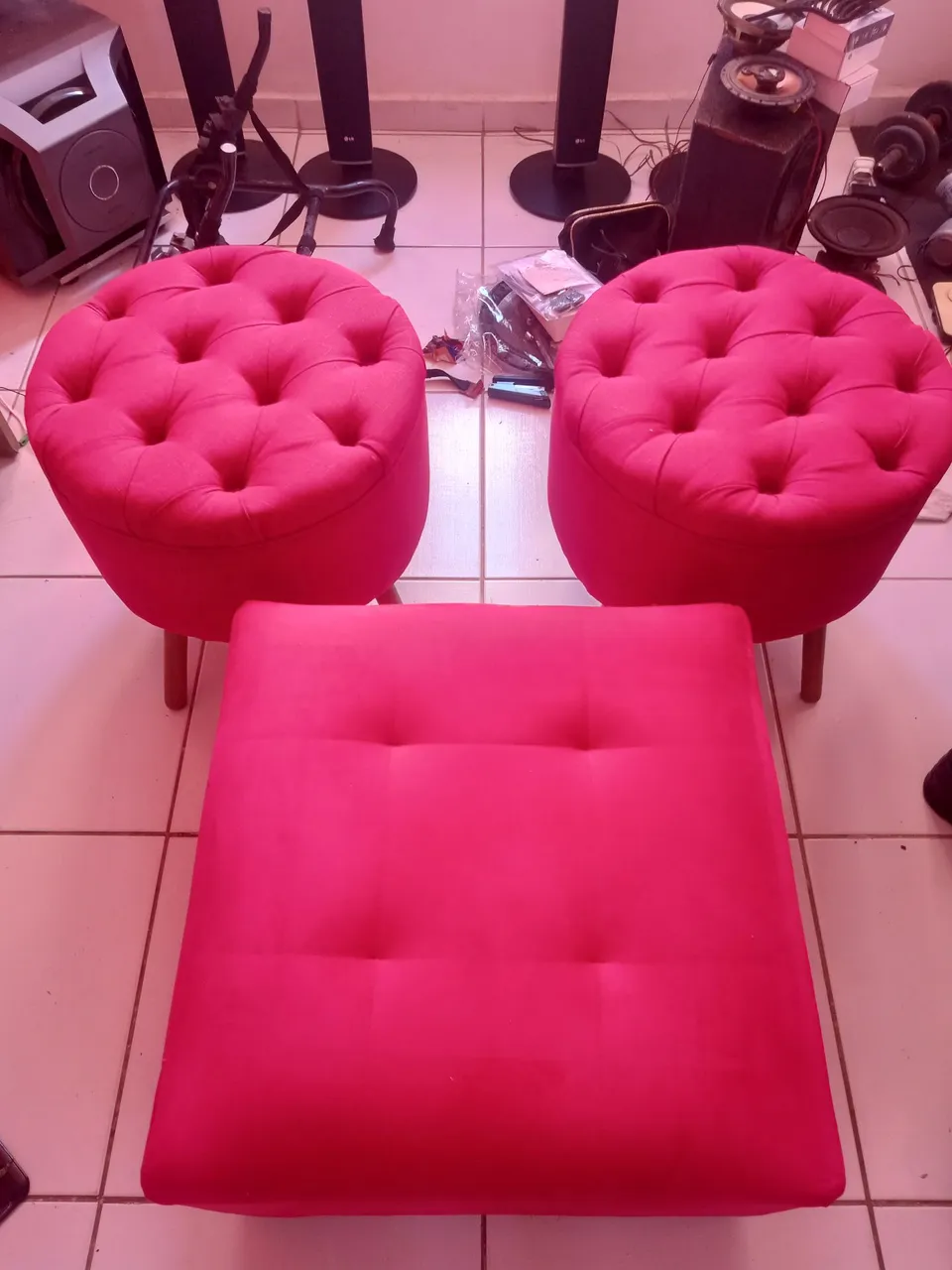 Kit com 3 unidades , Puffs grandes e confortáveis para dar um toque especial ao seu ambiente. Ideal para relaxar e decorar sua casa com estilo e elegância. O quadrado é de veludo 60x60 e os redondos de tecido 50x50 em estado de zero , pouco usados valor 550,00 falar com junior