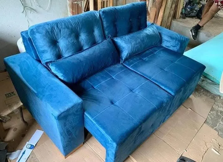 Sofá azul moderno, perfeito para sua sala. Design sofisticado e confortável, ideal para relaxar e receber visitas. Detalhes que agregam estilo e charme ao seu ambiente.