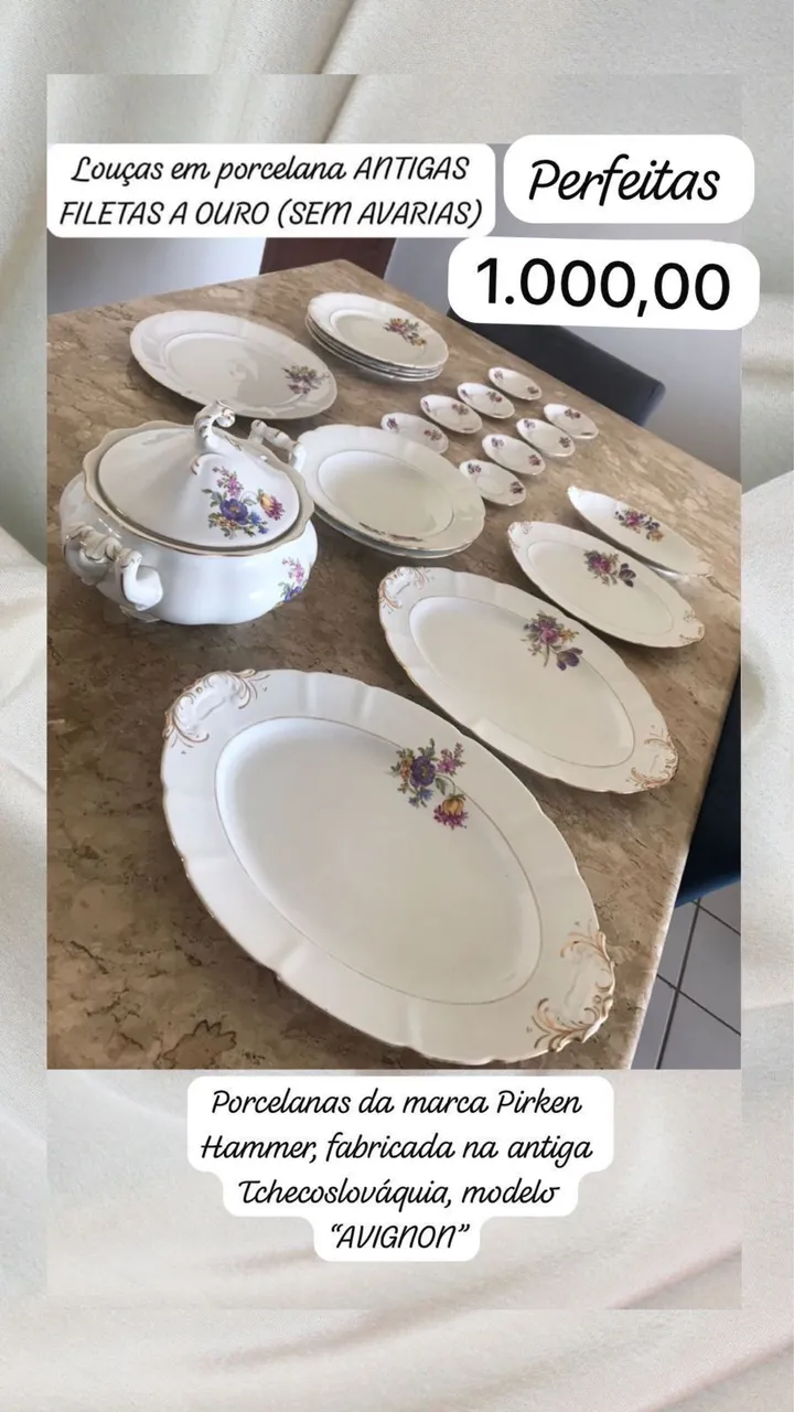 Conjunto de louças antigas de porcelana, filetas a ouro (sem avarias), modelo "AVIGNON" da marca Pirken Hammer, fabricadas na antiga Tchecoslováquia.