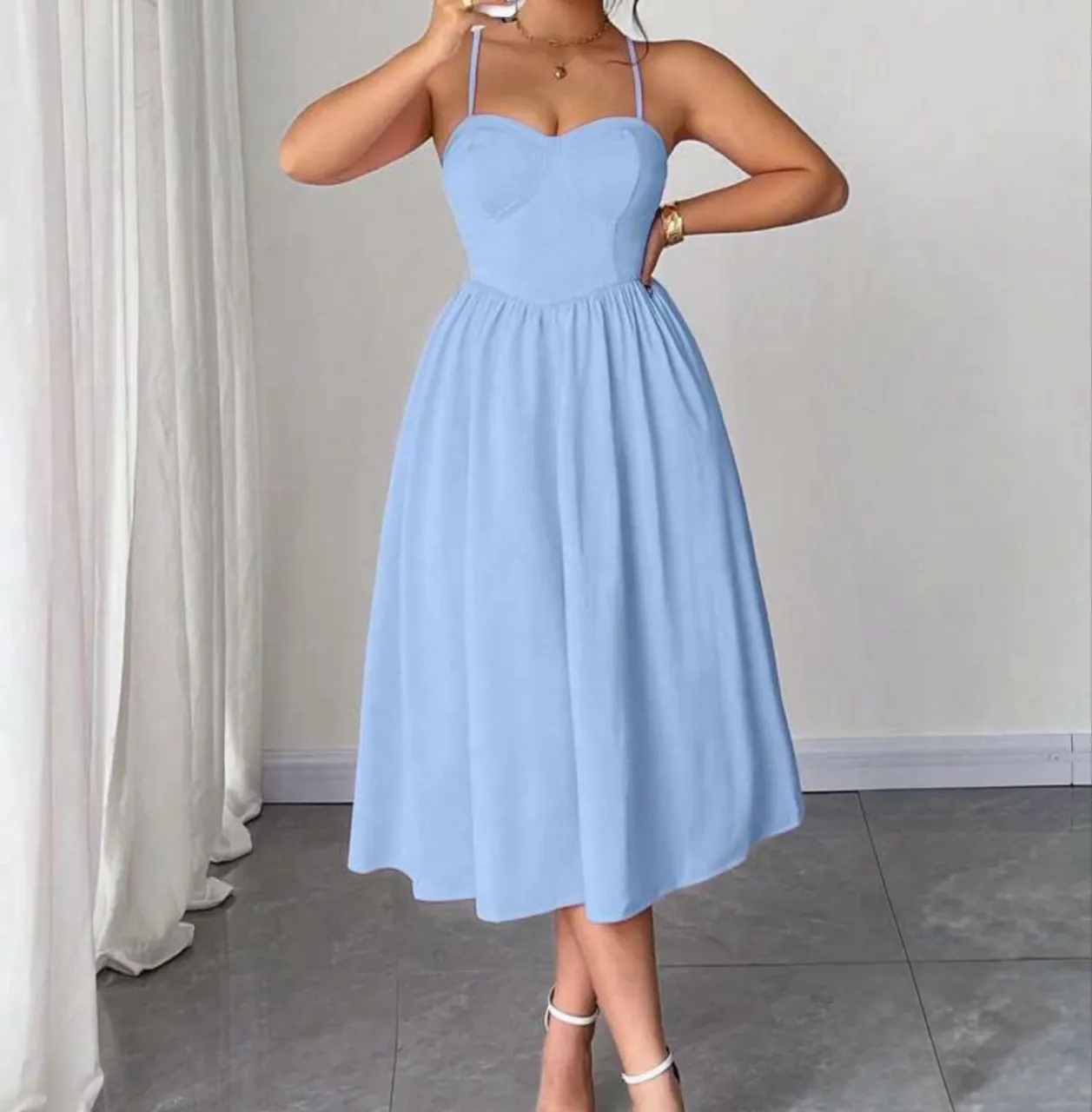 Vestido azul com detalhe tipo corset no busto, alças reguláveis, nunca usado