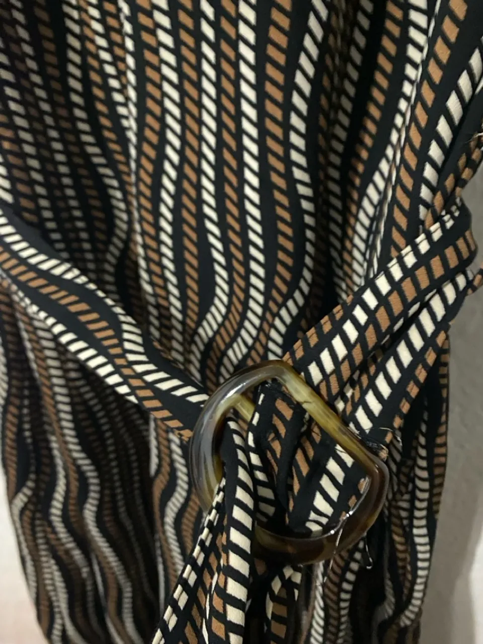 Vestido com estampa geométrica em tons de preto, branco e marrom. Possui cinto para ajuste e valorização da silhueta.