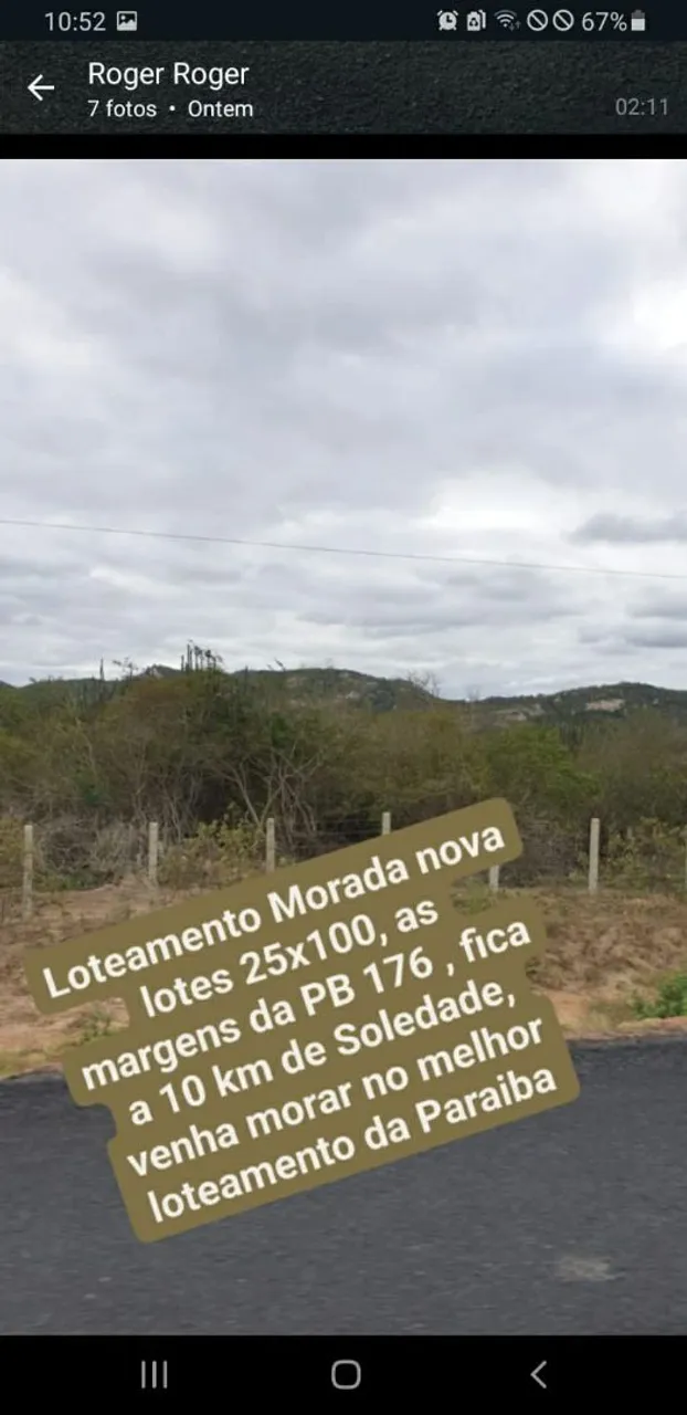 Vendo lotes de 25x100, as margens da PB 176, asfaltada, 10 km de Soledade,PB; Terra fértil, tranquilidade, energia próximo, vista p a serra e acesso, com futuras instalações de parque e abrigo p animais...ZAP 83 ... ver número