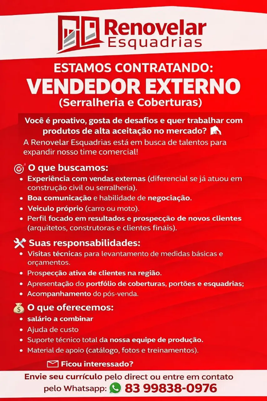 ESTAMOS CONTRATANDO: VENDEDOR EXTERNO (Serralheria e Coberturas)